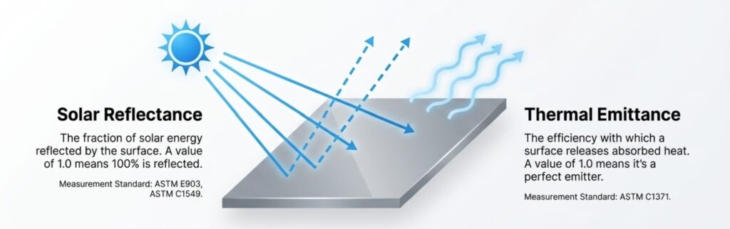 Think of it this way. R-value works through thickness and mass. The material absorbs heat, holds it for a while, and delays its movement. Emissivity is different. It is a surface behavior that decides whether heat is reflected away or allowed to load into the structure in the first place. Traditional insulation behaves like a sponge. It soaks up heat until it is saturated. High-performance surface treatments act more like a shield. They try to stop the heat before it ever gets inside.